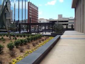 Initiated to revamp the aging Bank of Oklahoma Plaza, a project that spanned four decades, the renovation initiative commenced by overhauling the waterproofing system. Central to this was the meticulous replacement of all brick pavers, giving way to a fresh waterproof barrier layered with ornate colored concrete. Charcoal gray plaster-finished planters crowned with gray cast stone caps completed the refined appearance. Enhancements extended to the exterior as well, with the incorporation of modern steel and aluminum pergolas, along with strategically placed planters, benches, and thoughtfully arranged landscaping elements, culminating in an alluring and welcoming plaza.
