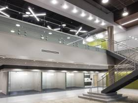 The main portion of work centered on the College and Career Center which includes classrooms, science labs, a coffee shop, the Great Hall, and a state-of-the-art Media Center with an integrated green room and cantilevered broadcast room. The Wall of Technology in the renovated entrance hall is the design centerpiece – an exposed steel frame sits behind a large glass curtain that is complimented by metal panels and backlighting, opening the building to the street.