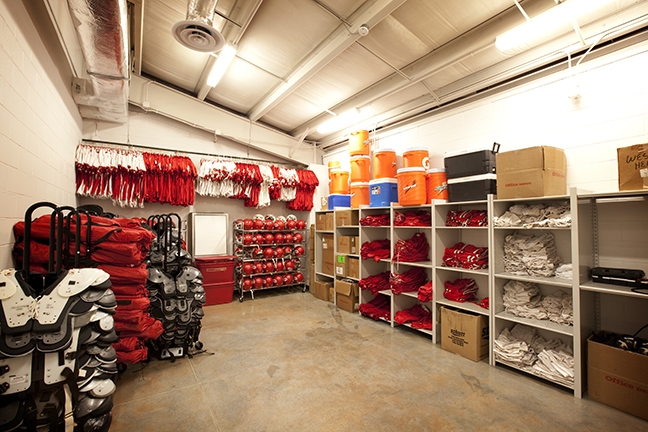 The new sports center houses locker rooms, a shower area, male and female restrooms, weight and training rooms, and offices for the athletics coaches of the high school students.